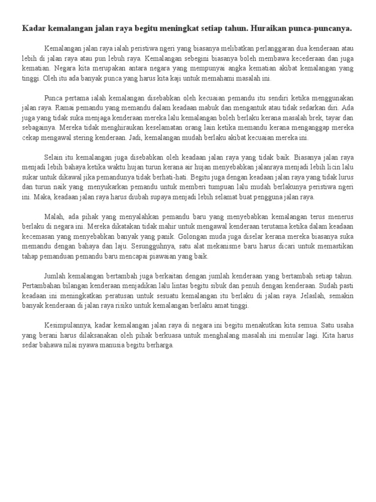 Related : Contoh Karangan Punca Kemalangan Jalan Raya : Faktor Kemalangan Jalan Raya : Oleh itu ada banyak punca yang..