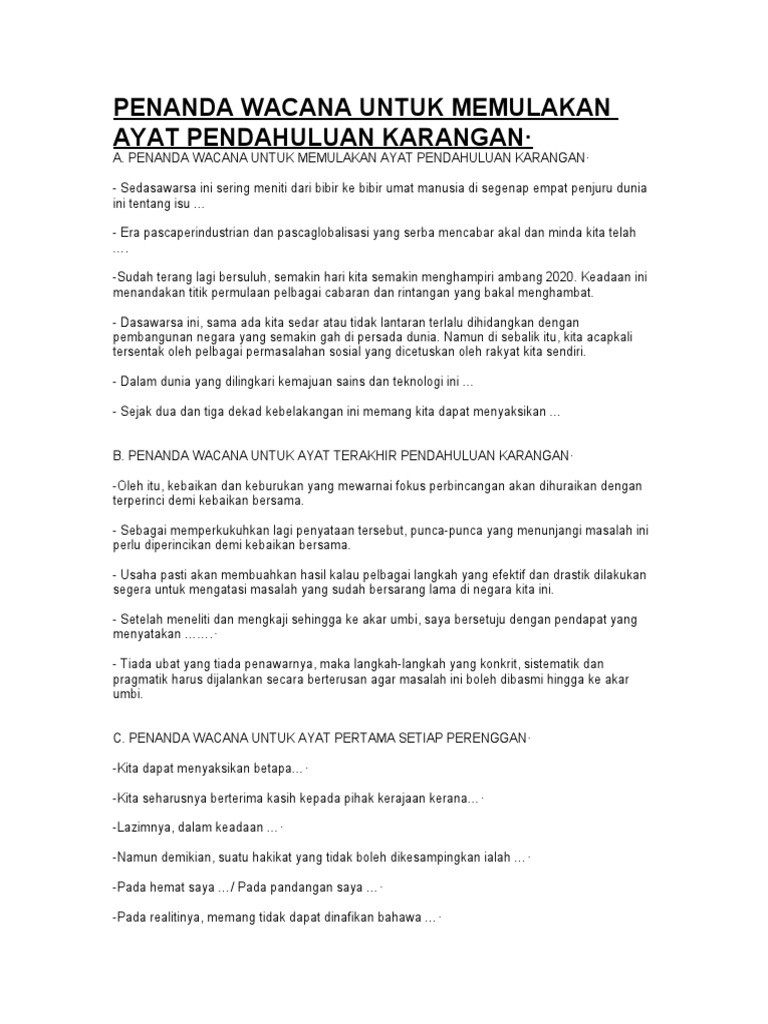 PENANDA WACANA Dalam Karangan from imgv2-2-f.scribdassets.com I) penanda wacana untuk memulakan karangan. Pada era globalisasi ini, pada zaman pascakemerdekaan ini, dalam meniti arus kemodenan ini, dewasa ini, pada masa ini, kini. Dalam meniti arus kemodenan ini, d. Dalam meniti kehidupan pada marcapada, i. Kepentingan penanda wacana dalam karangan. Unsur penanda wacana dalam teks ucapan 41 muhammad faiul, mohd penanda kohesi pada wacana commit to user iii penanda kohesi pada wacana rubrik 68$5$0$+$6,6:$ dalam harian. Kegagalan dalam penggunaan penanda wacana yang tepat akan menyebabkan seluruh wacana tidak mempunyai kesatuan dan perpautan yang lengkap. Penanda wacana untuk memulakan ayat pendahuluan karangan·.